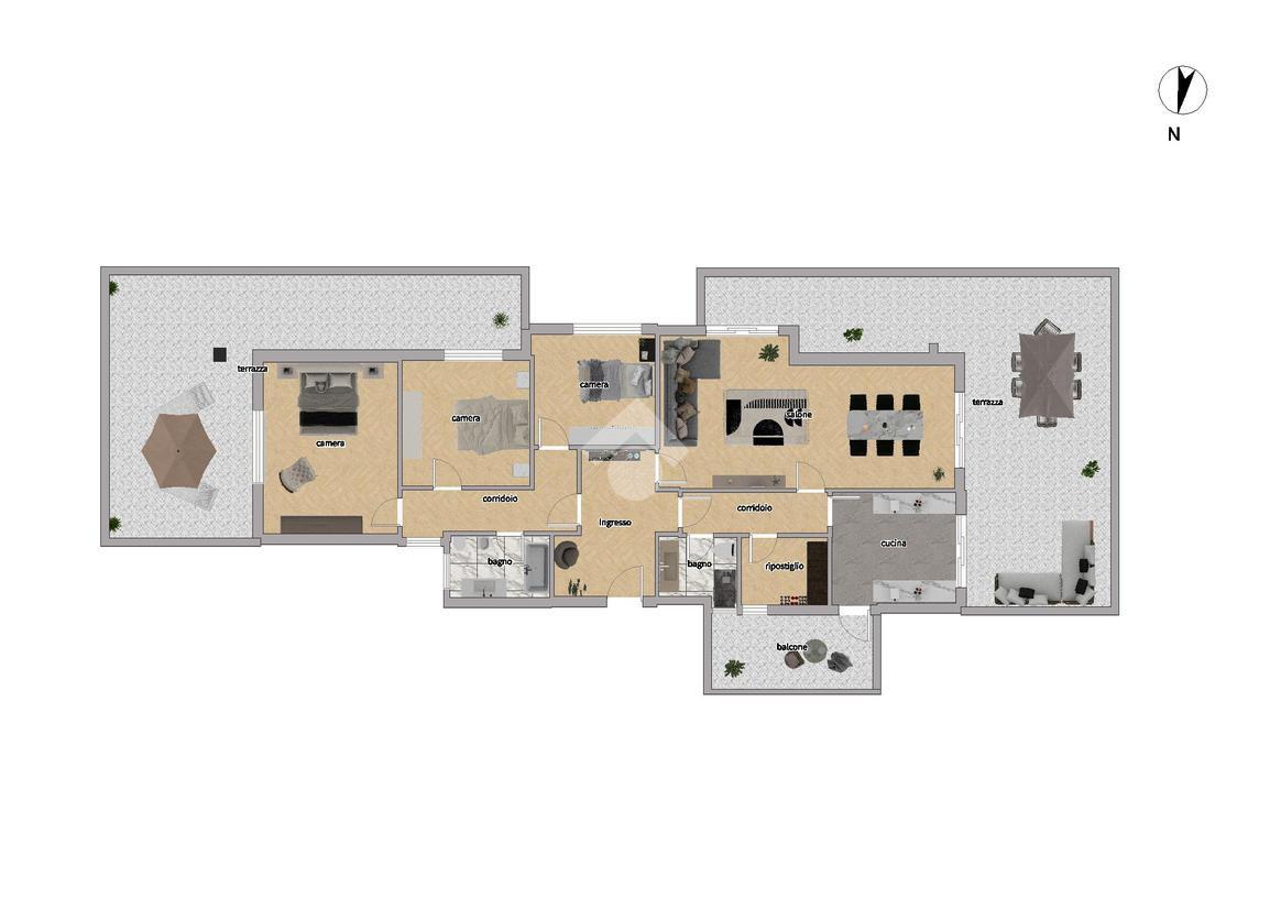 In contesto residenziale ma adiacente ai principali servizi, proponiamo appartamento quadrilocale di ampia metratura, con due comodi terrazzi ciascuno di . 50 mq.