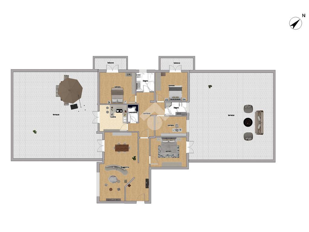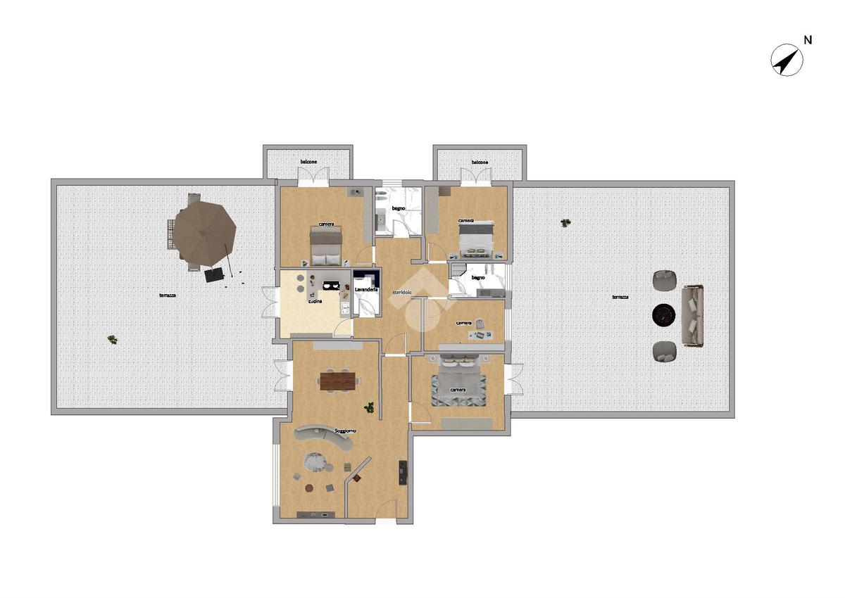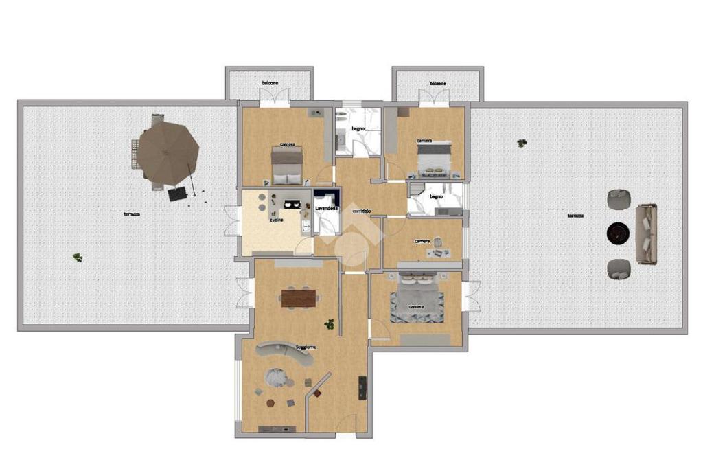 Internamente composto da: ingresso, salone, cucina abitabile, 4 camere da letto, 2 bagni entrambi finestrati, 2 balconi e 2 terrazzi di circa 120 mq ciascuno.