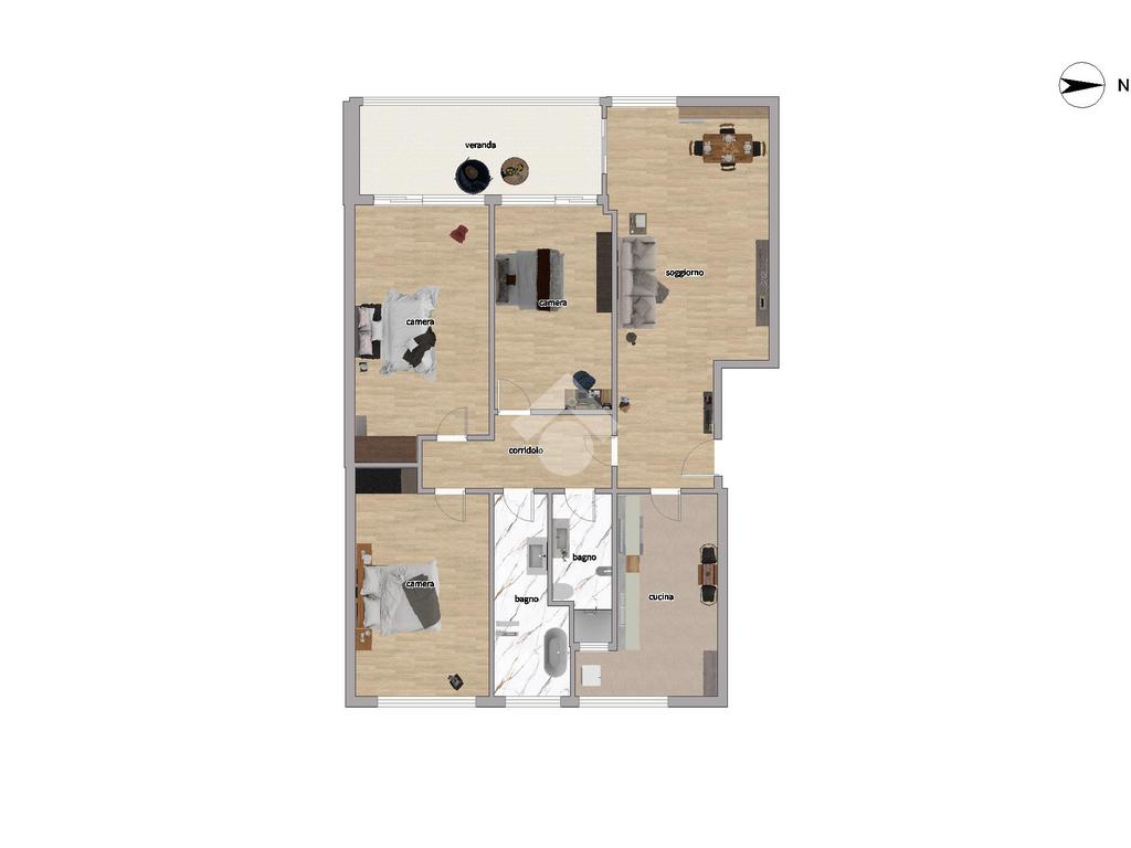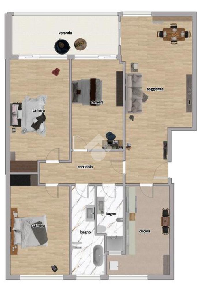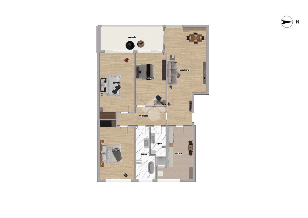 Internamente composto da: ingresso, salone, cucina abitabile, 3 camere da letto, 2 bagni entrambi finestrati (uno con vasca e uno con doccia), e veranda.