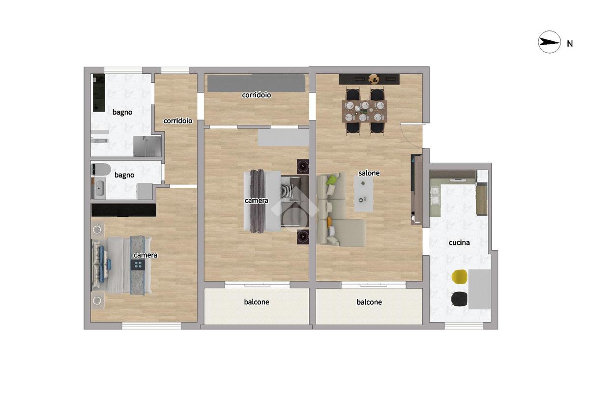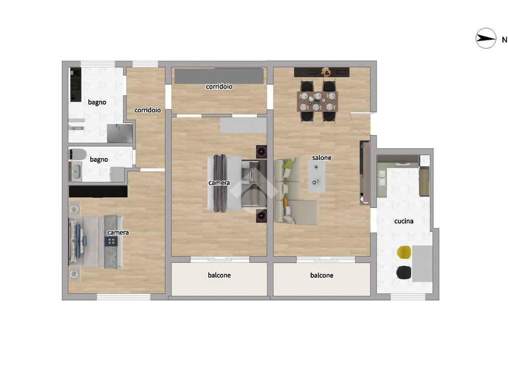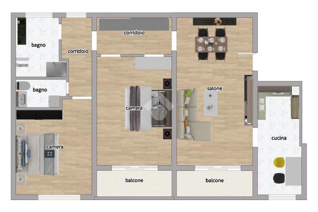 Internamente composto da: salone, cucina abitabile, 2 camere da letto matrimoniali, 2 bagni e 2 balconi.