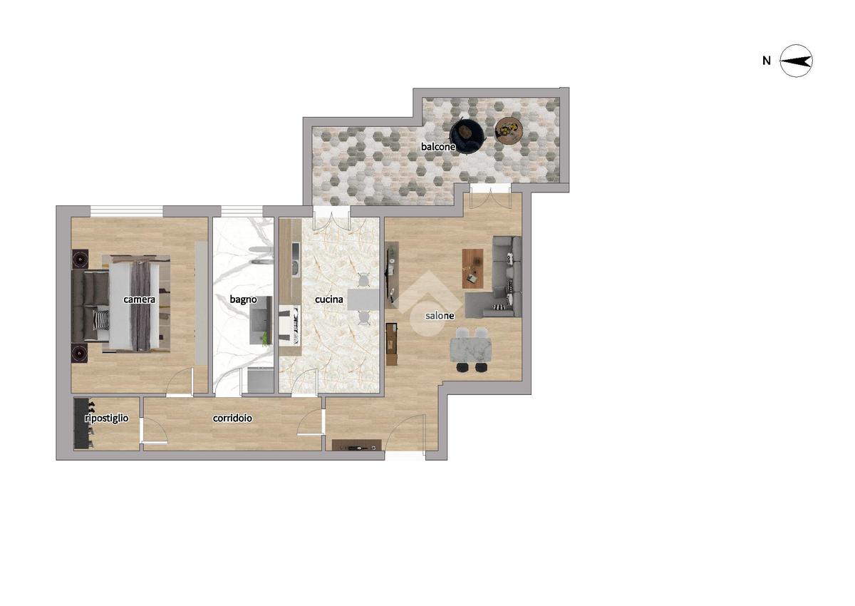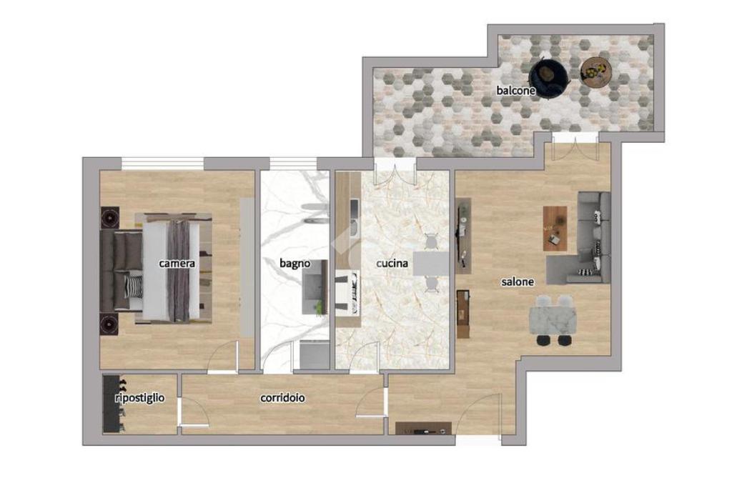 Internamente composto da: ingresso, salone, cucina, camera matrimoniale, bagno finestrato, ripostiglio e comodo balcone.