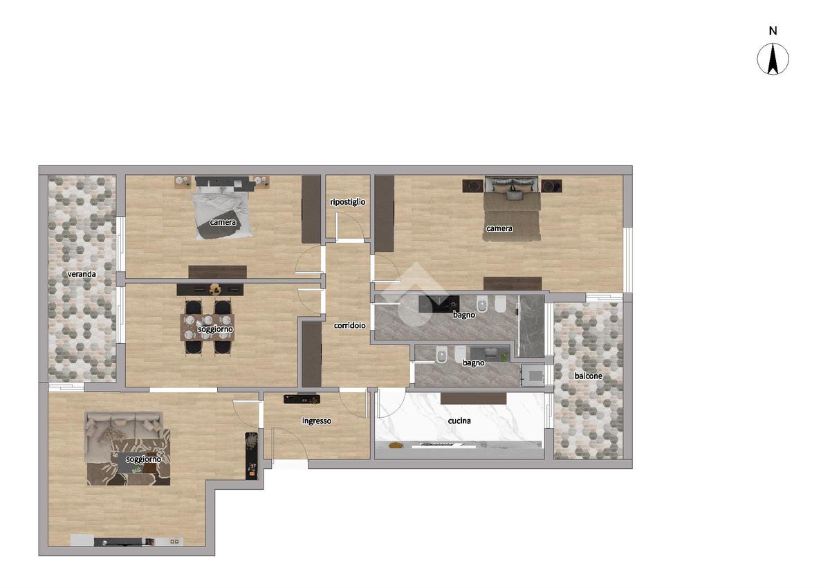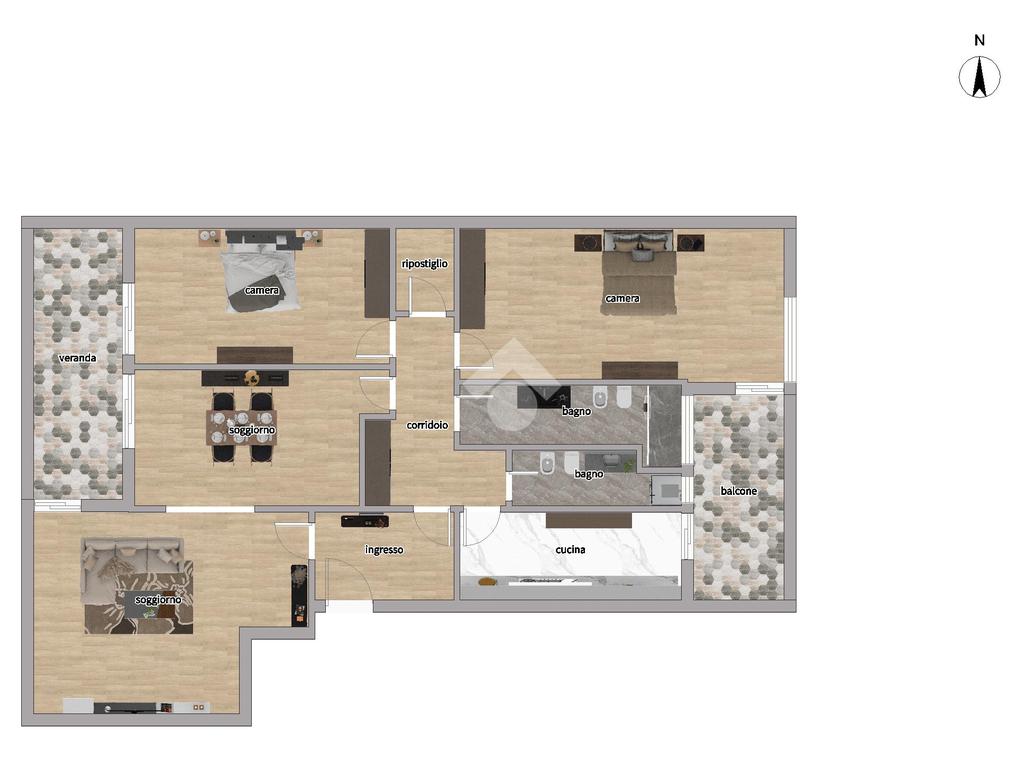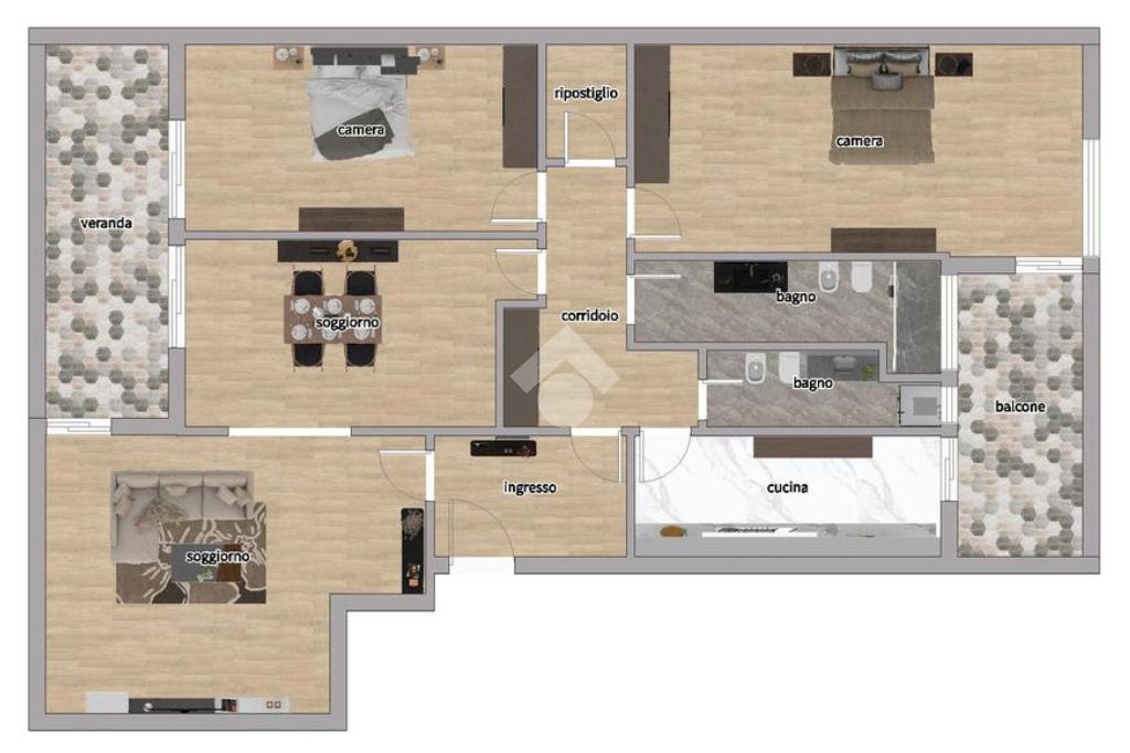 Internamente composto da: ingresso, salone doppio, cucina abitabile, 2 camere da letto matrimoniali, 2 bagni entrambi finestrati, una veranda, un balcone e un ripostiglio.