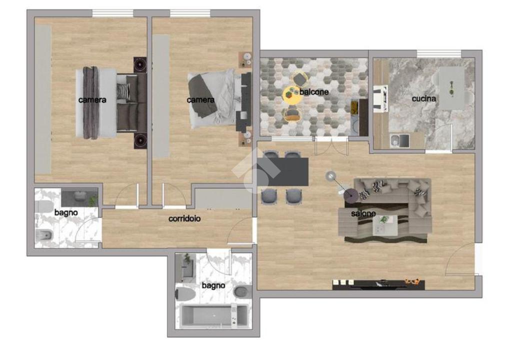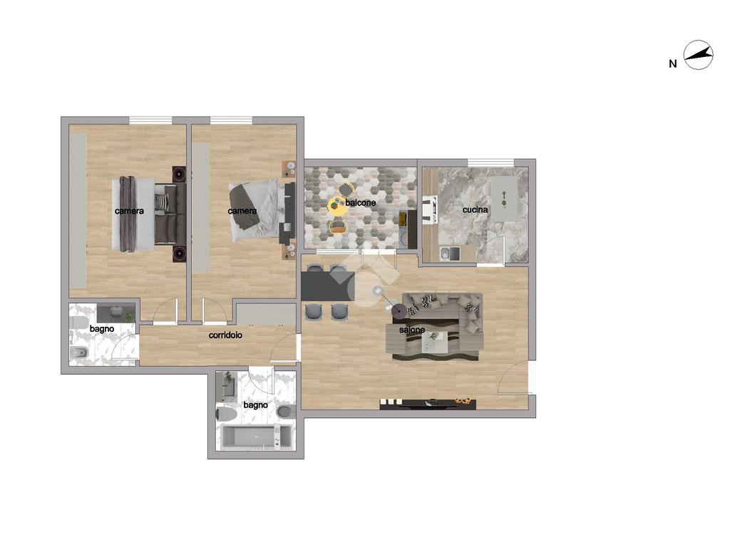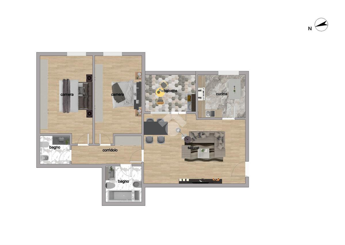 Internamente composto da: salone, cucina, 2 camere matrimoniali, 2 bagni e balcone.